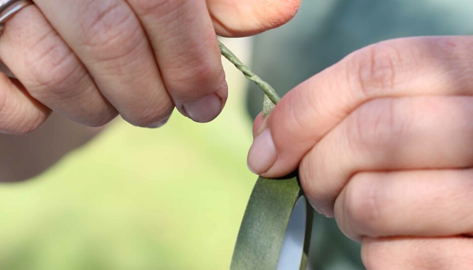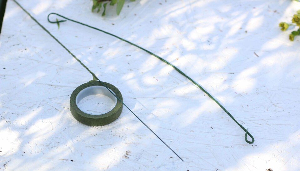 – Ståltråden er glatt, mens floratapen er litt klebrig og gjør ståltråden tykkere, slik at vi har noe å binde blomstene fast i. Jeg bare surrer den rundt, den fester seg i seg selv, sier Charlotte.