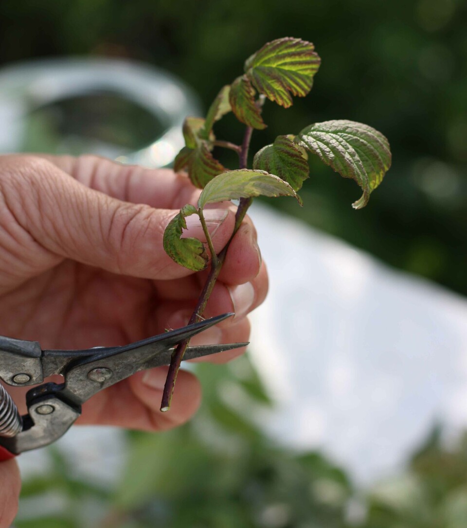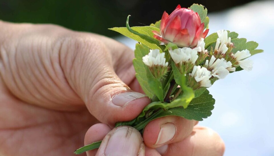– Klipp plantematerialet i korte lengder, ikke mer enn fem centimeter. Jeg pleier å lage en liten bukett med kanskje tre-fire stilker. Den her blir en fin liten bukket, sier hun og viser frem en liten bunt med et par blomster og noen blad.