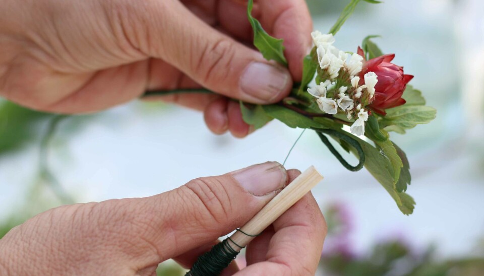 – Det er morsomt med litt forskjellige buketter, men du kan også gjenta deg selv hvis du vil ha et mønster. Hvis du vil ha en litt stram, ryddig krans, som jeg lager, unngå store, lange planter. Hvis du vil ha det stort, kan du bruke større ting. Men det er lurt å tenke på hvilke blomster som vil holde seg. En pion vil kollapse ganske raskt. Vi er glade i papirblomster og valmuekapsler til hodekranser fordi de varer.