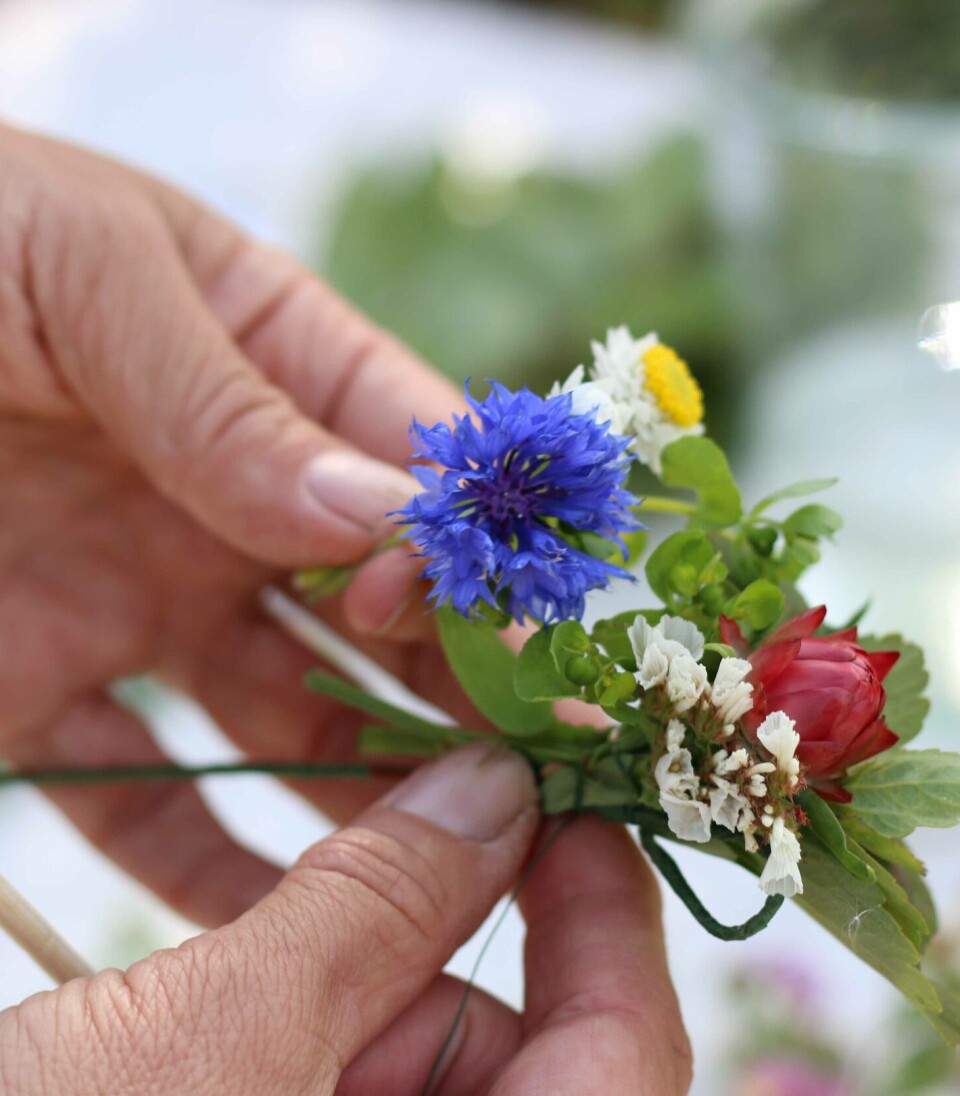 Blomster og blad fester hun langs buen med blomstertråd – en liten bukett om gangen.