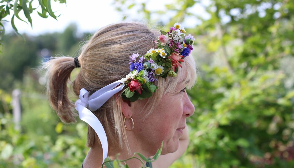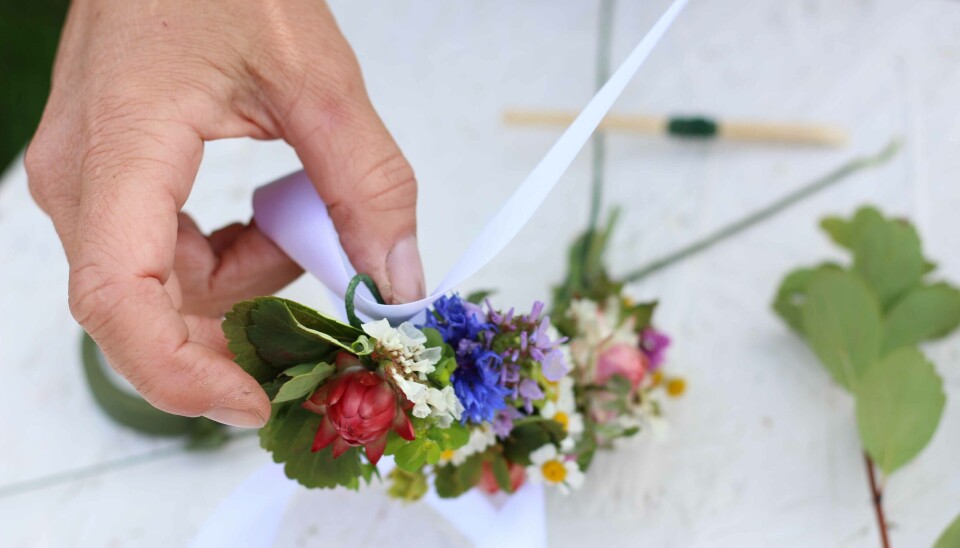 – Til slutt bare knyter du silkebåndet gjennom her og knyter på baksiden. Da passer den til et hvilket som helst hode. Vi binder ikke en hel krans fordi de blir ofte for store eller for små. Disse blir som en tiara.