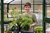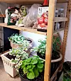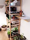 Hyller til nødvendig dyrkeutstyr utnytter høyden og tar minst mulig plass. Der det er mulig dyrker jeg i to etasjer. De to store dyrkebordene mine er spesiallaget for å passe «proffe» dyrkebrett med riller til fordeling av vann og min arbeidshøyde. Tørkerulldispenseren er montert i praktisk nappehøyde.
